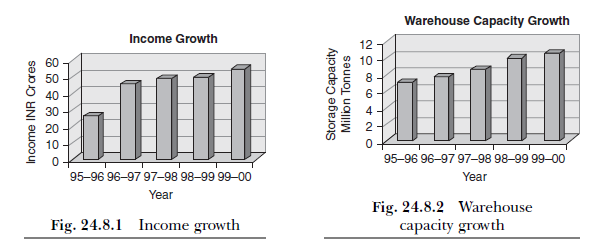 Organization Set-up. The firm is headed by the managing director, who is assisted by the general managers heading operations, finance, engineering, administration and business development. The business development department looks after site selection for new warehouses, feasibility study and market development activities. The engineering department is responsible for construction of new warehouses; maintenance of the old ones; and maintenance of the food grain stocks through usage of pesticides and fumigation process. The operations department is concerned with the marketing of storage space, market development and maximizing the storage capacity utilization of the firm. The present average capacity (floor area) utilization over the year is 75 per cent.