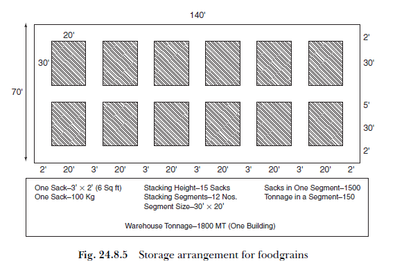 Warehousing Centres. The firm has 130 warehousing centres with 10 million tonnes storage capacity in the state of Maharashtra. These centres are located at the major district and taluka levels and at the major food grains and cotton seed producing and trading centres in the state. The products stored are food grains, cereals, pulses, spices, oil cake, coffee seeds, newsprint reels, cement, fertilizers, sugar, jaggery and industrial products. The storage of industrial products is done at the major industrial centres such as Pune, Nashik, Mumbai, Aurangabad, Jalgaon and Nagpur. The industrial manufactured products contribute 18 per cent of the throughput in tonnage per year. The average storage capacity of one warehouse centre varies from 1800 to 18,000 tonnes of food grains. At one warehouse centre there may be 3-10 buildings, each of such building is 140′ Lx 70′ Wx 30 Ht and can store 1800 tonnes of food grains. The inside storage arrangement is similar to the one indicated below. The maximum permissible storage height of the food grain stack is 15 layers of sacks, each of 3′ X 2′ size, which contains 100 kg of food grains. The storage space in the building is divided into 12 segments, each 30′ X 20′ size and with sufficient space in between the segments for ventilation and movement of persons.