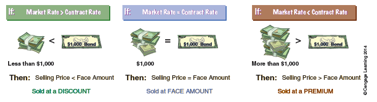 By comparing the market and contract rates of interest, it can be determined whether the bonds will sell for more than, less than, or at their face amount, as shown below.