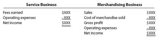 The activities of a service business differ from those of a merchandising business. These differences are illustrated in the following condensed income statements:
