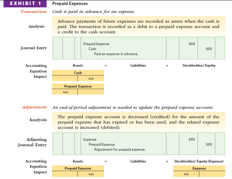 Prepaid expenses are the advance payment of future expenses and are recorded as assets when cash is paid. Prepaid expenses become expenses over time or during normal operations. To illustrate, the following transaction of NetSolutions from Chapter 2 is used.