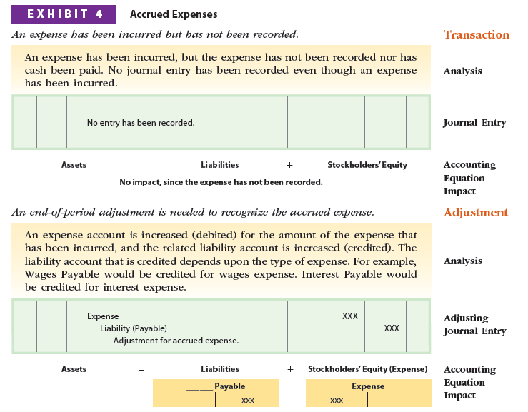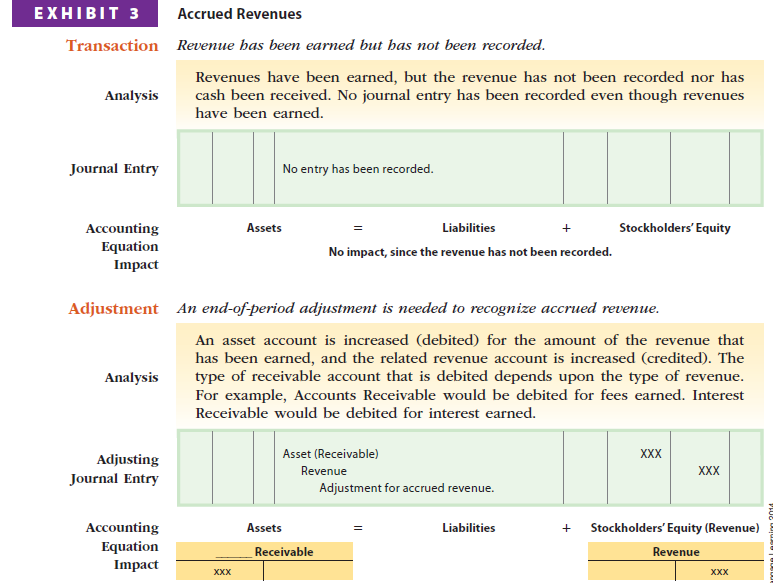 As illustrated in Exhibits 3 and 4, accrued revenues are earned revenues that are unrecorded. The cash receipts for accrued revenues are normally received in the next accounting period. Accrued expenses are expenses that have been incurred, but are unrecorded. The cash payments for accrued expenses are normally paid in the next accounting period.