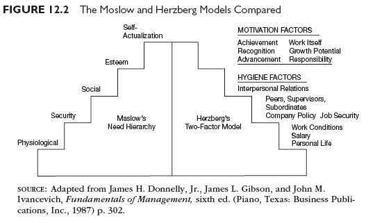 Figure 12.2 shows the considerable similarity of the Maslow and Herzberg models. Herzberg’s division of the need hierarchy into two factors—hygiene and motivational—implies that for many people, including most sales personnel, only Maslow’s higher-order needs (esteem and selfactualization) are primary motivators. Yet even these people must satisfy the lower-order (hygiene) needs for maintenance of their job satisfaction.