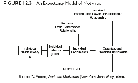 An expectancy model, based on Vroom’s, is shown in Figure 12.3. The strength of an individual’s motivation to behave in a certain way (in terms of efforts) depends upon how strongly that individual believes that these efforts will achieve the desired performance patterns (or level). If the individual achieves the desired performance, then how strongly does the individual believe that the organization’s rewards/punishments will be appropriate for that kind of performance, and to what extent will this satisfy the individual’s needs (goals)?