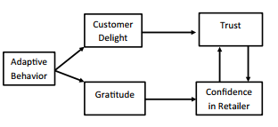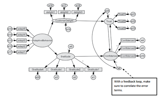 A non-recursive model is a structural model where there is a feedback loop between two con- structs. A recursive model is what we would consider a structural model where there are no reciprocal influences between constructs, or specifically, no feedback loops exist. The problem with feedback loops is you are creating an infinite loop in estimating the parameters between the feedback variables. Let’s look at another example using the construct of Customer Delight to help understand the complexities of non-recursive modeling. In this example, Adaptive Behav- ior of the employee influences customers’ feelings of delight but also a second construct called “Gratitude”. Gratitude is the customers’ feelings of appreciation or thankfulness to the employee. Customer Delight then influences the variable “Trust in the retailer”, or “Trust” for short, which is the degree to which a customer believes a retailer has their best interest in mind.The construct of “Gratitude” influences a construct called “Confidence in the Retailer”. Confidence in a Retailer is the belief in the ability of the retailer to perform a service.The constructs of Trust and Confi- dence in the Retailer have a reciprocal relationship where the more a customer trusts the retailer, the more confidence they have in them; and vice versa, the more confidence a customer has in the retailer, the more trust they will place with them. See Figure 10.33.