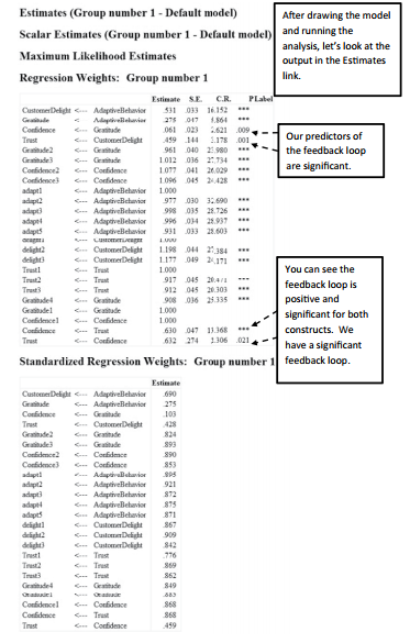 Figure 10.35 Estimate Output Showing Regression Weights for Direct Relationships and Feedback Loop