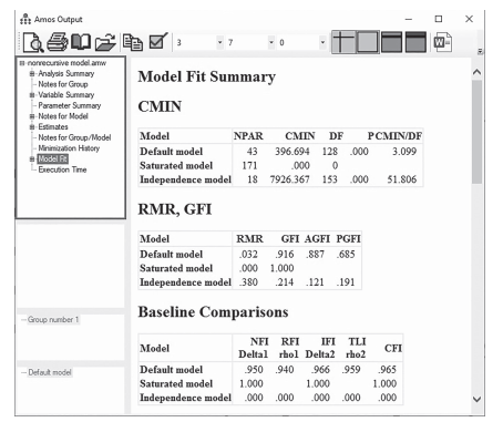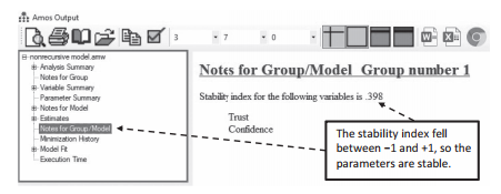 After initially finding a significant feedback loop, we need to check the stability of the relation- ships in the feedback loop.When AMOS detects that a non-recursive model is being analyzed, it will calculate the Stability index in the output. On the left-hand side, there is a tab called “Notes for Group/Model” that will show you the Stability index between Trust and Confidence in the Retailer. If you have multiple feedback loops, it will show you the index for all the proposed loops.