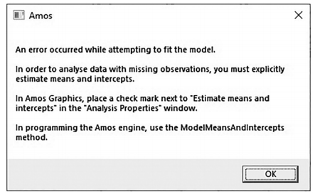 Note that if you don’t check the estimate means and intercepts option and have missing data, AMOS will prompt you with the following error message.