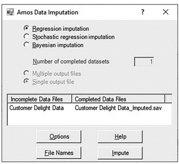 . This is located under the Analyze tab at the top menu in AMOS. After clicking this function, a pop-up window will appear. You want to make sure “Regression imputation” is chosen in the pop-up window. AMOS wants you to rename your data file if an imputation is performed. If you do not specifically state a new file name, AMOS will alter the name to your existing file name and put “imputed” on the end of the name. See Figure 10.40.