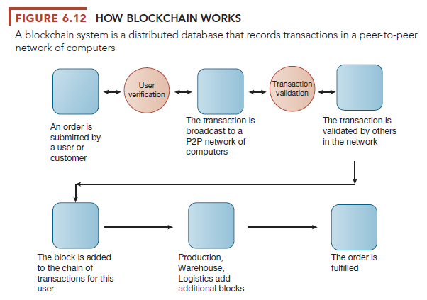 The blockchain maintains a continuously growing list of records called blocks. Each block contains a timestamp and link to a previous block. Once a block of data is recorded on the blockchain ledger, it cannot be altered retroactively. When someone wants to add a transaction, participants in the network (all of whom have copies of the existing blockchain) run algorithms to evaluate and verify the proposed transaction. Legitimate changes to the ledger are recorded across the blockchain in a matter of seconds or minutes and records are protected through cryptography. What makes a blockchain system possible and attractive to business firms is encryption and authentication of the actors and participating firms, which ensures that only legitimate actors can enter information, and only validated transactions are accepted. Once recorded, the transaction cannot be changed. Figure 6.12 illustrates how blockchain works for fulfilling an order.