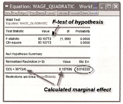 We can evaluate this marginal effect at a particular level of EXPER, such as EXPER = 18. To do this in EViews, from within the regression (which we named WAGE_QUADRATIC) window, select View/Coefficient Tests/Wald-Coefficient Restrictions
