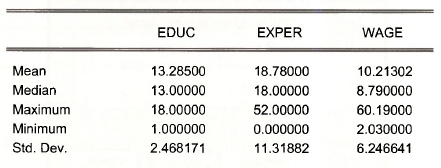 It may be useful to have a “picture” of the effect of experience on wage. Open a Group consisting of the variables EDUC, EXPER and WAGE. Do this by holding the Ctrl-key and clicking the series. Then double-click in the blue area. From the spreadsheet, click View/Descriptive Stats/Common Table
