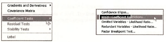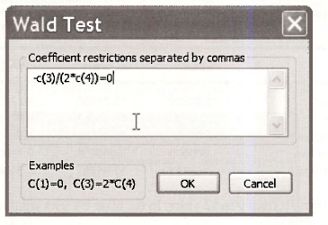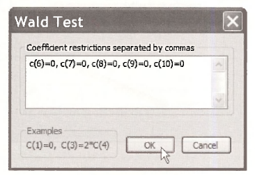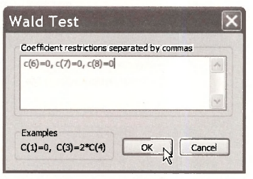 In the regression window, select View/Coefficient TestsAVald – Coefficient Restrictions. Using the equation representation we see that it is the coefficients C(3), C(4) and C(5) that we wish to test.