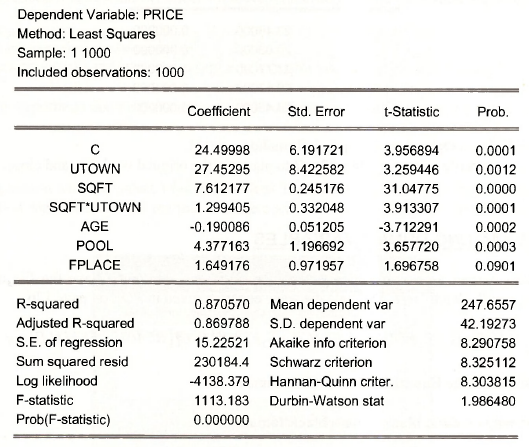 Opening a Group (hold Ctrl click each series, double-click in blue) with the variables we see that PRICE, SQFT and AGE contain the usual type of values, but the rest are 0’s and 1 ’s. These are dummy variables. They are used in a regression just like any other variables. Estimate the POE equation (7.13). Use Quick/Estimate Equation or enter the command