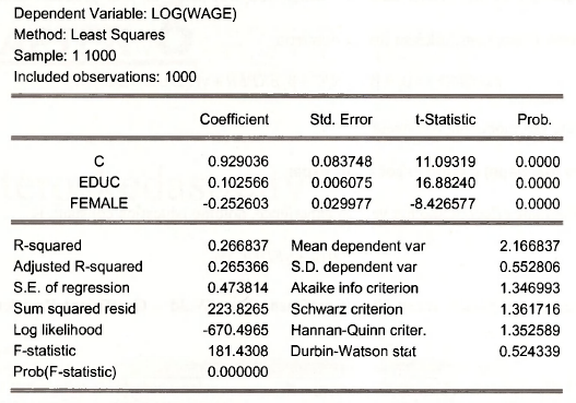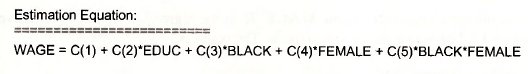 The exact calculation of the effect of gender on wages looks complicated, but it is simple in EViews. Select View/Coefficient Tests/Wald – Coefficient Restrictions. In EViews the exponential function is exp. To make the nonlinear calculation enter it as a hypothesis.