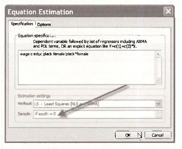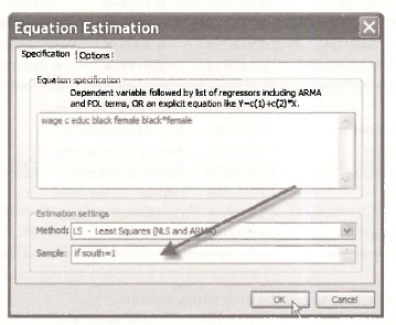 Obtaining the regression for the SOUTH observations is obtained by selecting Quick/Estimate Equation. In the dialog box enter the equation and modify the Sample to include observations for which SOUTH = 1.