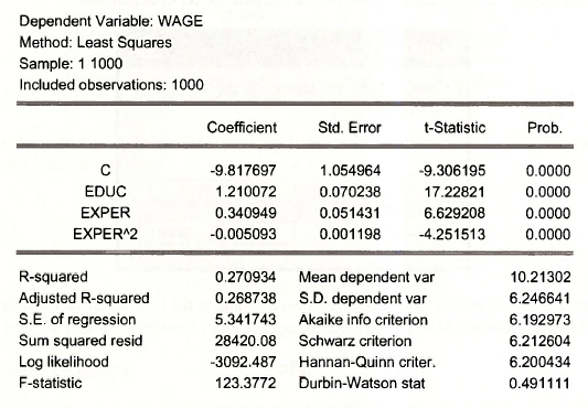 In EViews open the workfile cps_smaU.wfl. Save it under a new name, wagechap07.wfl. To estimate the wage equation with quadratic experience we enter the command