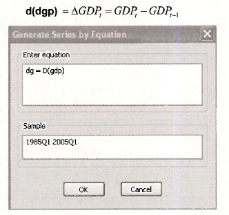 Time-series data display a variety of behavior. The data shown in Figure 12.1 is stored in the EViews workfile usa.wfl. They are real gross domestic product (GDP), inflation rate (INF), Federal funds rate (F) and the 3-year Bond rate (B). The changes for real gross domestic product (DG), inflation (DI), Federal funds rate (DF) and the 3-year Bond rate (DB) are computed using Genr and EViews first-difference operator d. For example,
