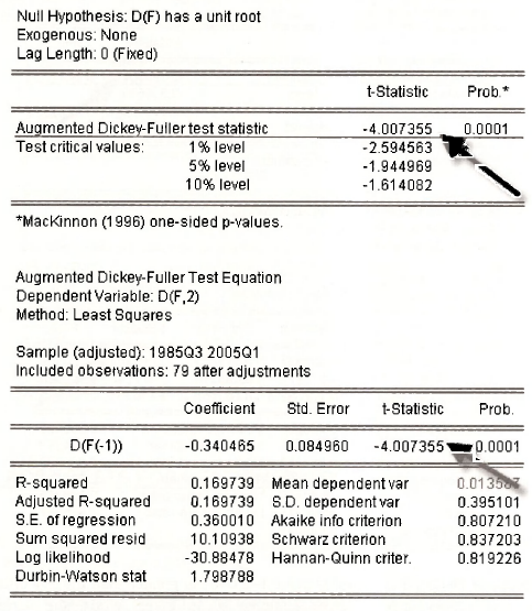 Since the calculated Dickey-Fuller test statistic (-4.007) is less than the 5% critical value of (-1.945) we reject the null of nonstationarity. In other words, the variable d(f) = AF is a stationary series.