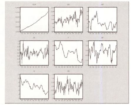 Clicking on OK produces the EViews ouput below. This set of graphs illustrate the variety of behavior observed with time series data, such as ‘trending’ (see GDP), ‘wandering around a trend’ (see F, and B), ‘wandering around a constant’ (see INF), ‘fluctuating around a trend’ (see DG) and fluctuating around a constant (see DI, DF, and DB). In general, nonstationary variables display wandering behavior (around constant and/or trend) while stationary data display fluctuating behavior (around constant and/or trend).