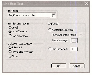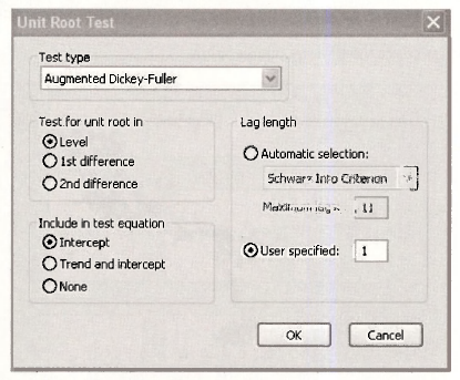 Clicking on OK, will produce the Dickey-Fuller test with an intercept and with one lag term.