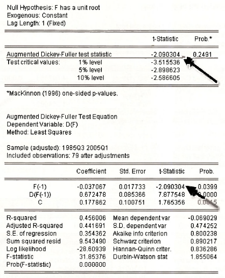Since the calculated Dickey-Fuller test statistic (-2.090) is greater than the 5% critical value of (-2.899), do not reject the null of nonstationarity. In other words, the variable F is a nonstationary series.