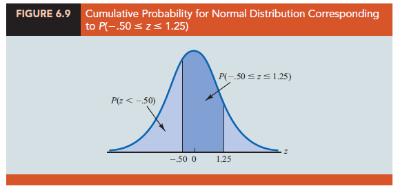 To illustrate the second type of probability calculation we show how to compute the probability that z is in the interval between -.50 and 1.25; that is, P(-.50 < z < 1.25). Figure 6.9 shows this area, or probability.