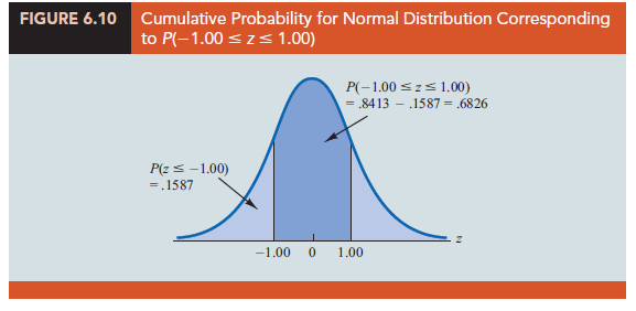 = .8413 – .1587 = .6826. This probability is shown graphically in Figure 6.10.
