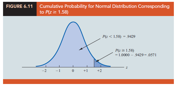 The value in the z = 1.5 row and the .08 column of the cumulative normal table is .9429; thus, P(z < 1.58) = .9429. However, because the total area under the normal curve is 1, P(z > 1.58) = 1 – .9429 = .0571. This probability is shown in Figure 6.11.