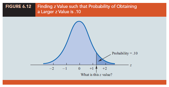 In the preceding illustrations, we showed how to compute probabilities given specified z values. In some situations, we are given a probability and are interested in working backward to find the corresponding z value. Suppose we want to find a z value such that the probability of obtaining a larger z value is .10. Figure 6.12 shows this situation graphically.