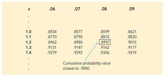Recall that the standard normal probability table gives the area under the curve to the left of a particular z value. We have been given the information that the area in the upper tail of the curve is .10. Hence, the area under the curve to the left of the unknown z value must equal .9000. Scanning the body of the table, we find .8997 is the cumulative probability value closest to .9000. The section of the table providing this result follows.