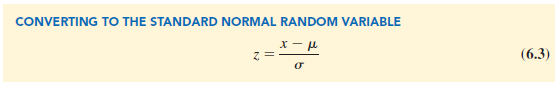 The reason for discussing the standard normal distribution so extensively is that probabilities for all normal distributions can be computed using the standard normal distribution. That is, when we have a normal distribution with any mean m and any standard deviation s, we can answer probability questions about the distribution by first converting to the standard normal distribution. Then we can use the standard normal probability table and the appropriate z values to find the desired probabilities. The formula used to convert any normal random variable x with mean m and standard deviation s to the standard normal random variable z follows.