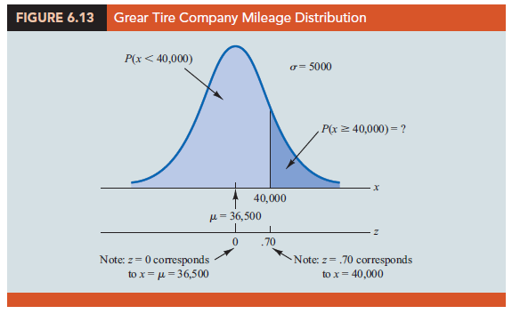 We turn now to an application of the normal probability distribution. Suppose the Grear Tire Company developed a new steel-belted radial tire to be sold through a national chain of discount stores. Because the tire is a new product, Grear’s managers believe that the mileage guarantee offered with the tire will be an important factor in the acceptance of the product. Before finalizing the tire mileage guarantee policy, Grear’s managers want probability information about x = number of miles the tires will last.