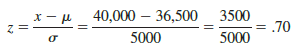 From actual road tests with the tires, Grear’s engineering group estimated that the mean tire mileage is m = 36,500 miles and that the standard deviation is s = 5000. In addition, the data collected indicate that a normal distribution is a reasonable assumption. What percentage of the tires can be expected to last more than 40,000 miles? In other words, what is the probability that the tire mileage, x, will exceed 40,000? This question can be answered by finding the area of the darkly shaded region in Figure 6.13.