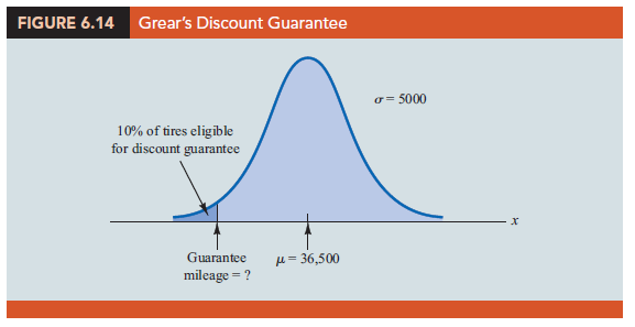 Let us now assume that Grear is considering a guarantee that will provide a discount on replacement tires if the original tires do not provide the guaranteed mileage. What should the guarantee mileage be if Grear wants no more than 10% of the tires to be eligible for the discount guarantee? This question is interpreted graphically in Figure 6.14.