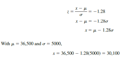 According to Figure 6.14, the area under the curve to the left of the unknown guarantee mileage must be .10. So, we must first find the z value that cuts off an area of .10 in the left tail of a standard normal distribution. Using the standard normal probability table, we see that z = —1.28 cuts off an area of .10 in the lower tail. Hence, z = —1.28 is the value of the standard normal random variable corresponding to the desired mileage guarantee on the Grear Tire normal distribution. To find the value of x corresponding to z = —1.28, we have