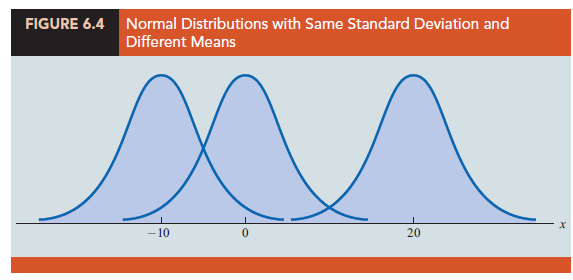 - The mean of the distribution can be any numerical value: negative, zero, or positive. Three normal distributions with the same standard deviation but three different means (-10, 0, and 20) are shown in Figure 6.4.