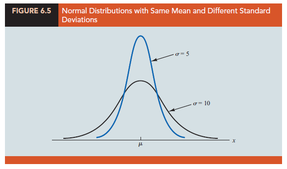 - The standard deviation determines how flat and wide the normal curve is. Larger values of the standard deviation result in wider, flatter curves, showing more variability in the data. Two normal distributions with the same mean but with different standard deviations are shown in Figure 6.5.