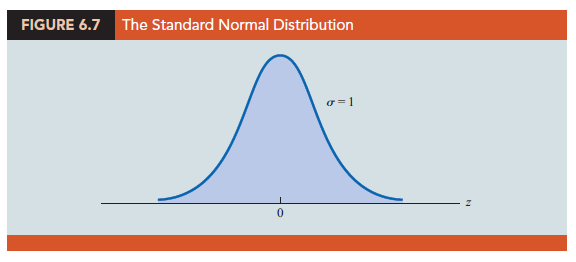 A random variable that has a normal distribution with a mean of zero and a standard deviation of one is said to have a standard normal probability distribution. The letter z is commonly used to designate this particular normal random variable. Figure 6.7 is the graph of the standard normal distribution. It has the same general appearance as other normal distributions, but with the special properties of μ = 0 and σ = 1.