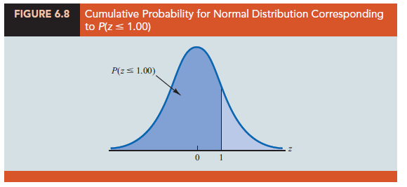 We start by showing how to compute the probability that z is less than or equal to 1.00; that is, P(z < 1.00). This cumulative probability is the area under the normal curve to the left of z = 1.00 in Figure 6.8.