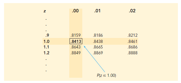 Refer to the standard normal portability table. The cumulative probability corresponding to z = 1.00 is the table value located at the intersection of the row labeled 1.0 and the column labeled .00. First we find 1.0 in the left column of the table and then find .00 in the top row of the table. By looking in the body of the table, we find that the 1.0 row and the .00 column intersect at the value of .8413; thus, P(z < 1.00) = .8413. The following excerpt from the probability table shows these steps.