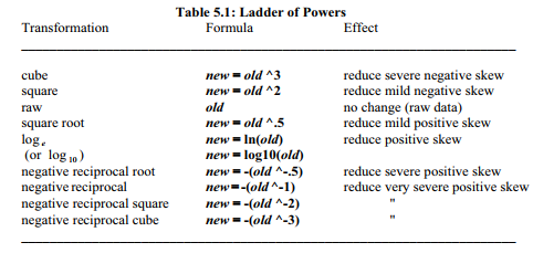 An alternative technique called Box-Cox transformation offers finer gradations between transformations and automates the choice among them (easier for the analyst, but not always a good thing). The command bcskewO finds a value of X (lambda) for the transformations