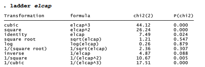 The ladder command combines the ladder of powers with sktest for normality. It tries each power on the ladder, and reports whether the result is significantly nonnormal. This can be illustrated using the positively skewed variable elcap, per capita electricity consumption, from electricity.dta.