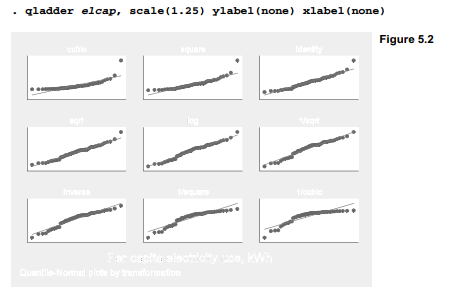 Figure 5.2 shows a corresponding set of quantile–normal plots for these ladder of powers transformations, obtained by thequantile ladder command qladder. (Type help ladder for information about ladder, gladder and qladder.) To make the tiny plots more readable in the example below, we scale the labels and marker symbols up by 25% with the scale(1.25) option. The axis labels (which would be unreadable and crowded) are suppressed by the options ylabel(none) xlabel(none)
