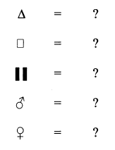 It would be wrong to assume that pictographic signs are always easy and unambiguous to read; also, some of them are ‘in between’ – for example the skull-and-crossbones sign to indicate danger (why not a graveyard?). Here the picture represents a concept; but there is a limit to how far pictures can depict the abstract. The relationship between sign and symbol, signifier and signified, is too deep a theoretical issue for us to consider here. It is sufficient to say that some ‘abstract’ symbols are more easily ‘read’ than others, whether they are conventional or not. Consider what these examples might mean (some more established than others).