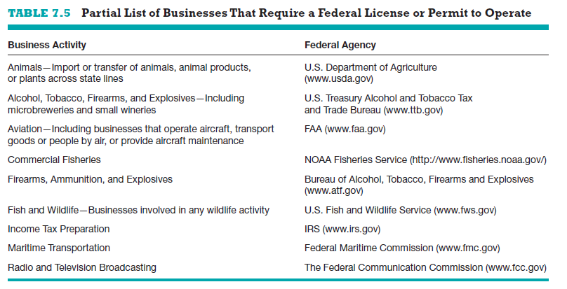 Most businesses do not require a federal license to operate, although some do. Table 7.5 contains a partial list of the business activities that require a federal li- cense or permit, along with the federal agency to contact and its website address. Seemingly simple businesses sometimes require more licenses and permits than one might think. For example, if you prepare tax returns for others you are re- quired by the IRS to register and obtain a tax preparer tax identification number (PTIN). Similarly, if you make beer that is sold, you’ll need a federal permit and a state liquor license. You do not need a federal permit or a state liquor license if you make beer strictly for personal consumption.