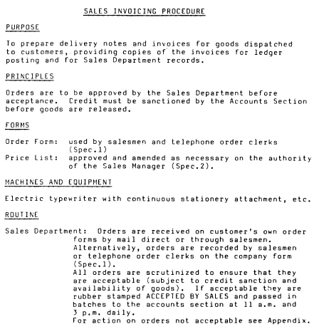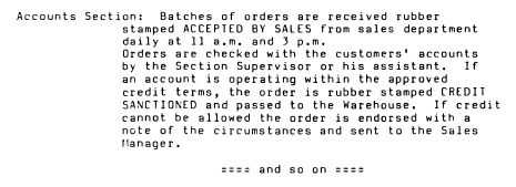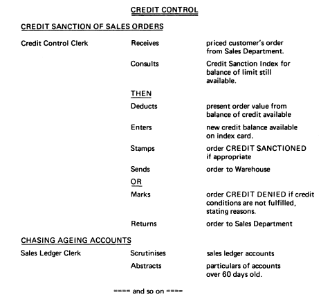 To take an example of 3 and 4: a purchase ledger clerk is asked ‘What do you do?’ and the reply is ‘Well, I receive a batch of RAs from the computer and file them. I then get a batch of CP listings from Cash. I go through the RAs with the CPs and mark up the RAs. An O/S list is given to Mr Tidmarsh once a fortnight.’