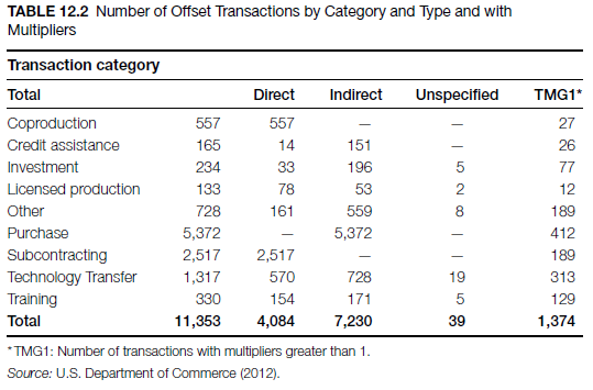 Offsets in defense trade encompass a range of industrial compensation arrangements required by foreign governments as a condition of the purchase of defense articles and services from a nondomestic source. This mandatory compensation can be directly related to the purchased defense article or service, or it can involve activities or goods unrelated to the defense sale. The U.S. government policy on offsets in defense trade states that the government considers offsets to be “economically inefficient and trade distorting,” and it prohibits any agency of the U.S. government from encouraging, entering directly into, or committing U.S. firms to any offset arrangement in connection with the sale of defense articles or services to foreign governments. U.S. defense contractors generally see offsets as a reality of the marketplace for companies competing for international defense sales (See Tables 12.1 and 12.2). Several U.S. defense contractors acknowledge that offsets are usually necessary in order to make defense sales—sales that can help support the U.S. industrial base. U.S. firms are required to report annually on contracts for the sale of defense articles or defense services to foreign governments or foreign firms that are subject to offset agreements exceeding $5 million in value and on offset transactions completed in performance of existing offset commitments for which offset credit of $250,000 or more has been claimed from the foreign representative (U.S. Department of Commerce, 2012).