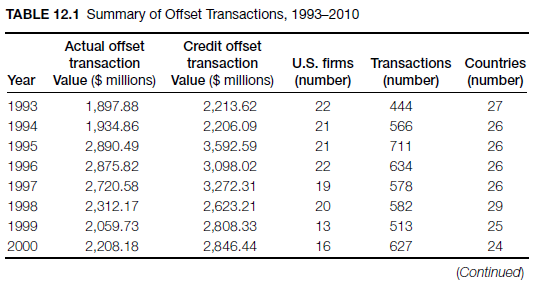 Offsets in defense trade encompass a range of industrial compensation arrangements required by foreign governments as a condition of the purchase of defense articles and services from a nondomestic source. This mandatory compensation can be directly related to the purchased defense article or service, or it can involve activities or goods unrelated to the defense sale. The U.S. government policy on offsets in defense trade states that the government considers offsets to be “economically inefficient and trade distorting,” and it prohibits any agency of the U.S. government from encouraging, entering directly into, or committing U.S. firms to any offset arrangement in connection with the sale of defense articles or services to foreign governments. U.S. defense contractors generally see offsets as a reality of the marketplace for companies competing for international defense sales (See Tables 12.1 and 12.2). Several U.S. defense contractors acknowledge that offsets are usually necessary in order to make defense sales—sales that can help support the U.S. industrial base. U.S. firms are required to report annually on contracts for the sale of defense articles or defense services to foreign governments or foreign firms that are subject to offset agreements exceeding $5 million in value and on offset transactions completed in performance of existing offset commitments for which offset credit of $250,000 or more has been claimed from the foreign representative (U.S. Department of Commerce, 2012).