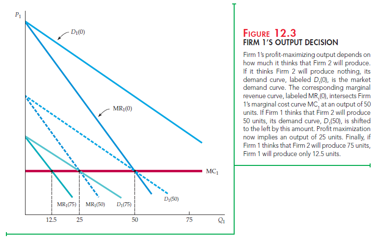 Suppose, instead, that Firm 1 thinks Firm 2 will produce 50 units. Then Firm 1’s demand curve is the market demand curve shifted to the left by 50. In Figure 12.3, this curve is labeled D1(50), and the corresponding marginal revenue curve is labeled MR1(50). Firm 1’s profit-maximizing output is now 25 units, the point where MR1(50) = MC1. Now, suppose Firm 1 thinks that Firm 2 will produce 75 units. Then Firm 1’s demand curve is the market demand curve shifted to the left by 75. It is labeled D1(75) in Figure 12.3, and the corresponding marginal revenue curve is labeled MR1(75). Firm 1’s profit-maximizing output is now 12.5 units, the point where MR1(75) = MC1. Finally, suppose Firm 1 thinks that Firm 2 will produce 100 units. Then Firm 1’s demand and marginal revenue curves (which are not shown in the figure) would intersect its marginal cost curve on the vertical axis; if Firm 1 thinks that Firm 2 will produce 100 units or more, it should produce nothing.